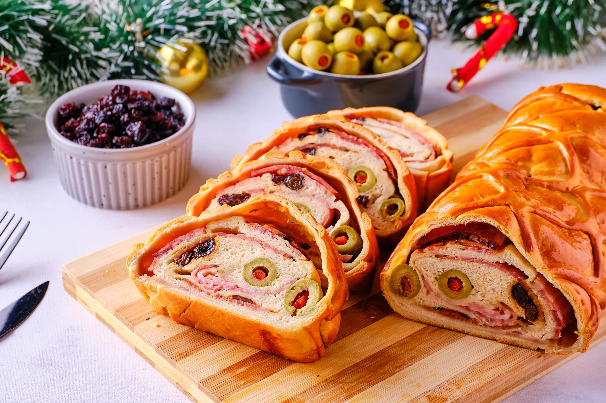 Tradicional pan venezolano relleno de jamón, tocineta, aceitunas y pasas.